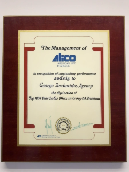 Βραβείο για την 1η θέση, Γραφείου Πωλήσεων σε Εισπραχθέντα Ασφάλιστρα Ομαδικών Συμβολαίων Ατυχημάτων και Υγείας στην Ελλάδα για το 1989.