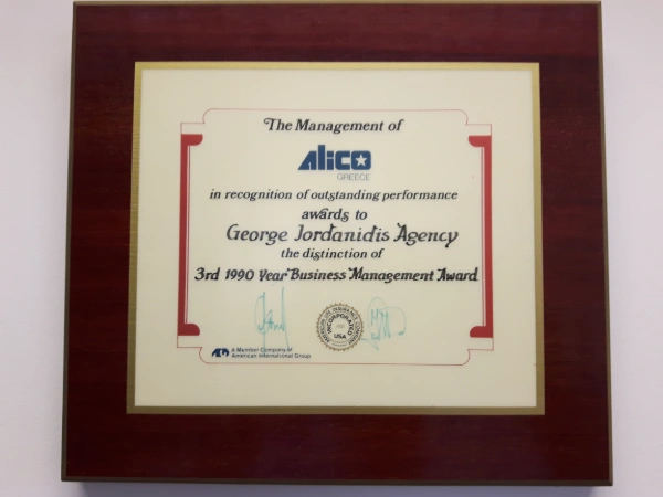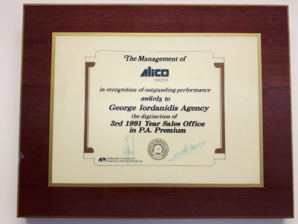 Βραβείο για την 3η θέση, Γραφείου Πωλήσεων σε Εισπραχθέντα Ασφάλιστρα Συμβολαίων Προσωπικών Ατυχημάτων και Υγείας στην Ελλάδα για το 1991.