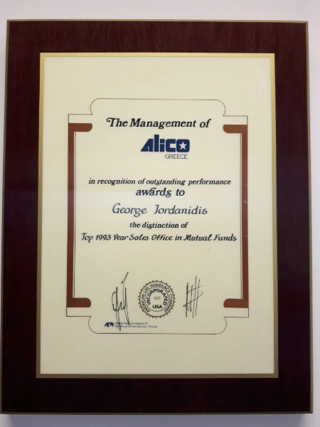 Βραβείο για την 1η θέση, Γραφείου Πωλήσεων σε Παραγωγή Αμοιβαίων Κεφαλαίων στην Ελλάδα για το 1993.
