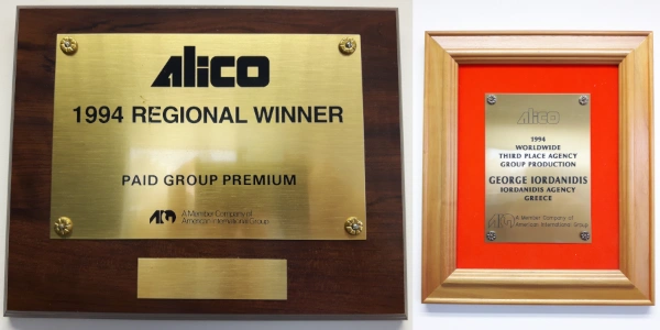 • Βραβείο για την 1η θέση, Γραφείου Πωλήσεων σε Εισπραχθέντα Ασφάλιστρα Ομαδικών Συμβολαίων στην Περιφέρεια Ευρώπης για το 1994.