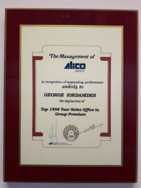 Βραβείο για την 1η θέση, Γραφείου Πωλήσεων σε Εισπραχθέντα Ασφάλιστρα Ομαδικών Συμβολαίων στην Ελλάδα για το 1998.