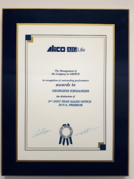 Βραβείο για την 2η θέση, Γραφείου Πωλήσεων σε Εισπραχθέντα Ασφάλιστρα Συμβολαίων Προσωπικών Ατυχημάτων και Υγείας στην Ελλάδα για το 2003.